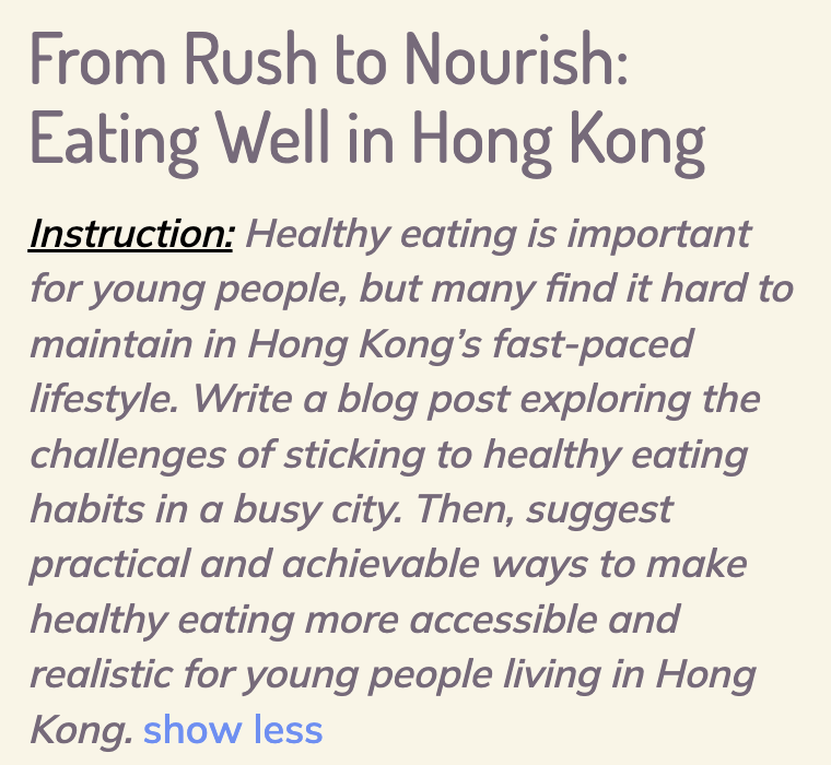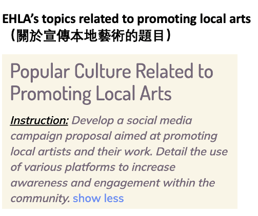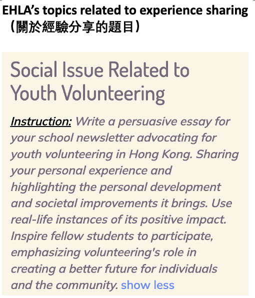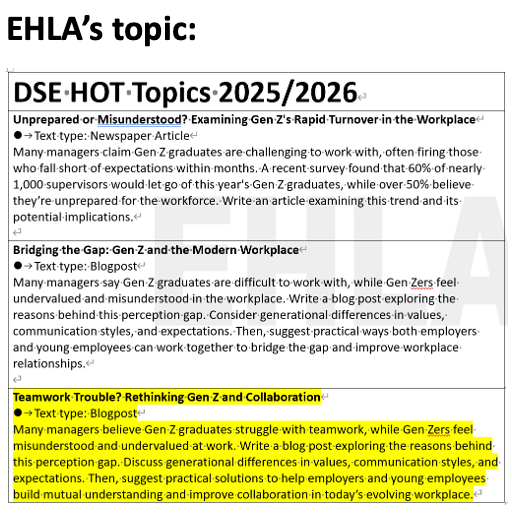 Indeed, a review of EHLA's topic bank and material pool reveals that it covers the 2025 DSE English Real Exam topics well, with notable alignments in Writing, Reading, and Speaking. Specifically, the coverage includes: