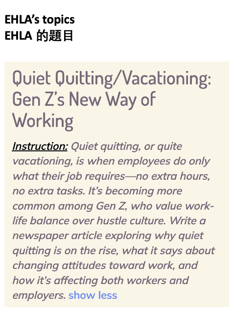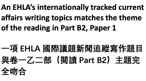 - An EHLA’s internationally tracked current affairs writing topics matches the theme of the reading in Part B2, Paper 1
